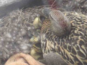 An accountant clerk by the name of Michael who works at Frost Bank noticed several weeks ago there was a mother duck outside his window. Day after day he watched a mother duck choose the concrete awning outside his window as the unlikely place to build a nest above the sidewalk. The mallard laid ten eggs in a nest in the corner of the planter that is perched over 10 feet in the air. She dutifully kept the eggs warm for weeks, and last Monday afternoon all of her ten ducklings hatched.