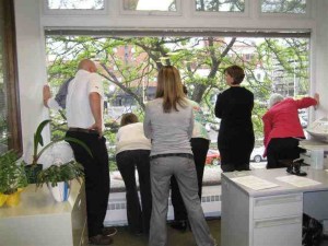 Michael worried all night how the momma duck was going to get those babies safely off their perch in a busy, downtown, urban environment to take to water, which typically happens in the first 48 hours of a duck hatching. Tuesday morning, Michael watched the mother duck encourage her babies to the edge of the perch with the intent to show them how to jump off. Office work came to a standstill as everyone gathered to watch.