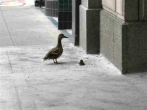 The mother flew down below and started quacking to her babies above. In disbelief Michael watched as the first fuzzy newborn trustingly toddled to the edge and astonishingly leapt into thin air, crashing onto the cement below. Michael couldn’t stand to watch this risky effort nine more times! He dashed out of his office and ran down the stairs to the sidewalk where the first obedient duckling, near its mother, was resting in a stupor after the near-fatal fall. Michael stood out of sight under the awning-planter, ready to help.